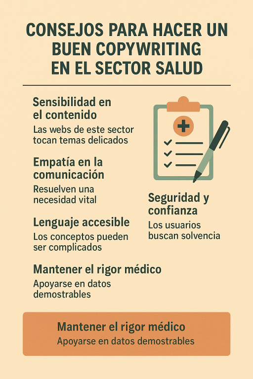 • Las webs de este sector tocan temas delicados que necesitan sensibilidad a la hora de mostrarlos al público. Cuando alguien acude a profesionales sanitarios lo hace porque sufre alguna dolencia y eso, aunque queramos ser comerciales, exige ser respetuoso tanto en el tono como en la forma de redactar.