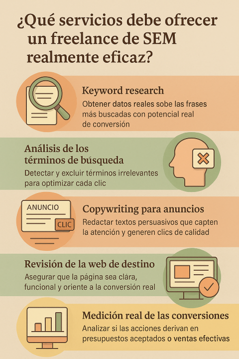 Pero ¿todo vale? En el artículo de hoy voy a explicarte qué servicios debe ofrecer un freelance de SEM realmente eficaz, para seas capaz de elegir al profesional adecuado para que tu marca cumpla con los objetivos que te has marcado. ¡Vamos a ello!